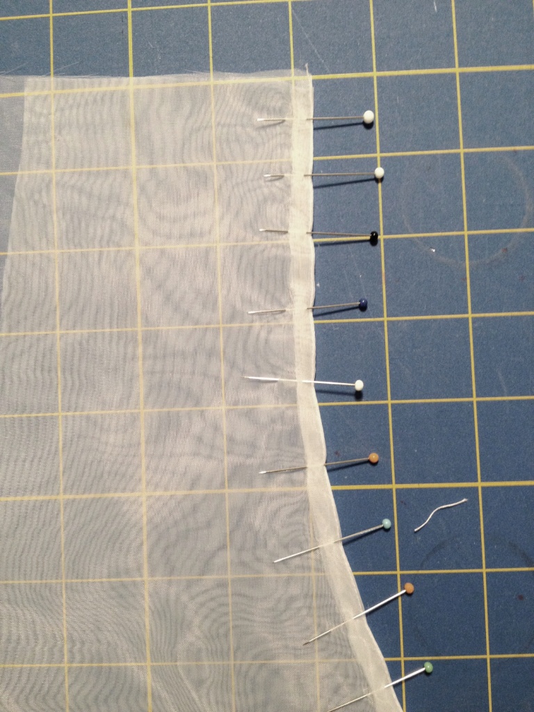 On one of the times that I forgot to pull out a pin; the needle hit it and tore the organza. Luckily, it was at the very bottom of the panel that was trimmed off. If it had happened in the center of the skirt, I would have had to start over with those panels.